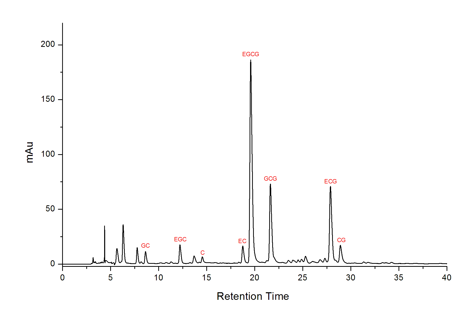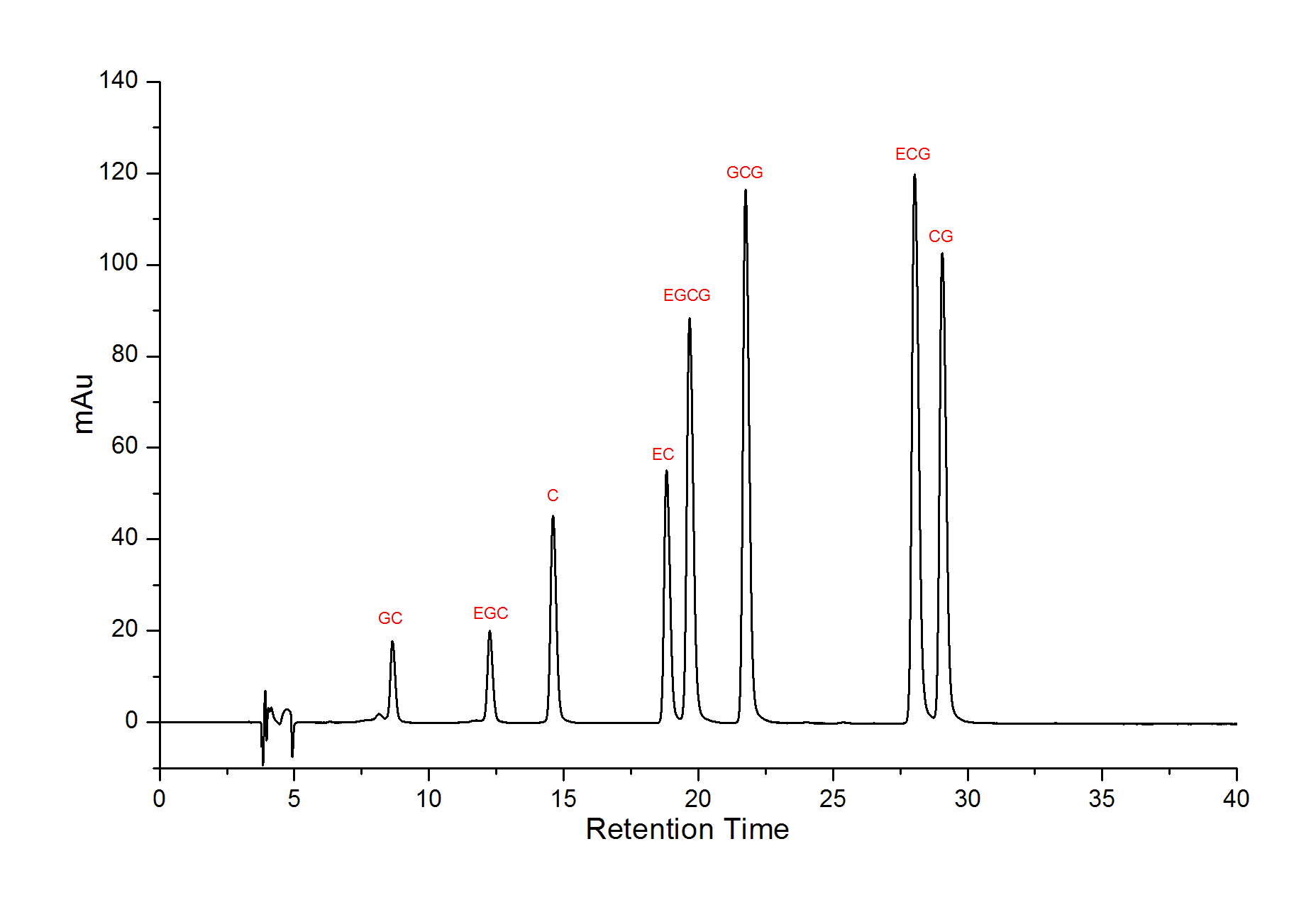 儿茶素类化合物在280nm下有吸收峰,可以利用高效液相色谱法测定其含量。如图Fig1为8种儿茶素单体的标品HPLC谱图,Fig2. 8种儿茶素单体的样本HPLC谱图。